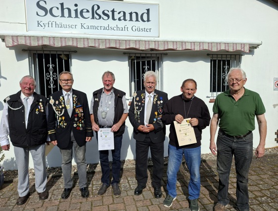 Der Landesschießwart begrüßte den Landesvorsitzenden Carl-Friedrich Busch und seinen Stellvertreter auch in der Funktion des Ehrenvorsitzenden der KK Güster, Holger P. Reimer! 136 Nadel und Urkunden gab es zu vergeben. Für die Nadeln 1. Bis 3. Plätze waren 1368 Zahlen und Buchstaben zu Gravieren, die vom Kameraden, Lutz Heinrich aus Boizenburg, zu einem enormen Sonderpreis gefertigt wurden! Bevor es zur Proklamation kam wurden noch zwei Schützenschnüre vergeben! In Gold an Jörg Denzien, KK Güster und in Silber an Björn Kalisch, KK Sachsenwald! Die KK Güster von 1959 als stärkste Kameradschaft im Landesverband, hatte bei allen Wettbewerben in den jeweiligen Disziplinen, überwiegend die Plätze 1 bis 3 belegt! So war es nicht verwunderlich, dass bei der Königsproklamation der 1. und 2. Ritter neben dem Landeskönig aus der Kameradschaft Güster kamen. Die meisten 1. Plätze in verschiedenen Disziplinen belegte der Schießwart der KK Güster, Klaus Henschel!