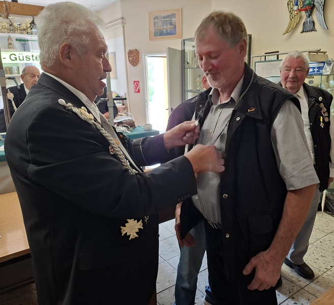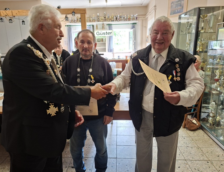 Beide Kameraden kommen von der KK-Güster! Herzlichen Glückwunsch! Nach dieser Auszeichnung nahm der Landesvorsitzende die Inthronisierung des alten Schützenkönigs,